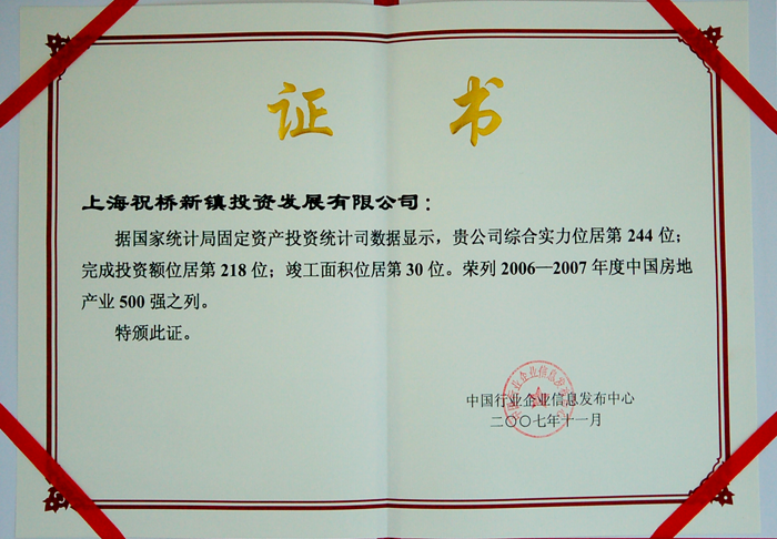 中國房地產(chǎn)聯(lián)合會在北京人民大會堂召開第六屆中國大型房地產(chǎn)業(yè)與建筑業(yè)500強(qiáng)企業(yè)高層論壇。中國行業(yè)企業(yè)信息發(fā)布中心在論壇上發(fā)布了國家統(tǒng)計局固定資產(chǎn)投資統(tǒng)計司的數(shù)據(jù)統(tǒng)計:公司被列為2007中國房地產(chǎn)業(yè)500強(qiáng)企業(yè)。其中三項數(shù)據(jù)同列500強(qiáng)之一:公司綜合實(shí)力位居第244位,完成投資額位居第218位,竣工面積位居第30位。