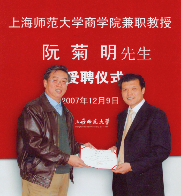 上海師范大學(xué)商學(xué)院黨委書記薛和生授予阮菊明總經(jīng)理上海師范大學(xué)商學(xué)院兼職教授稱號。