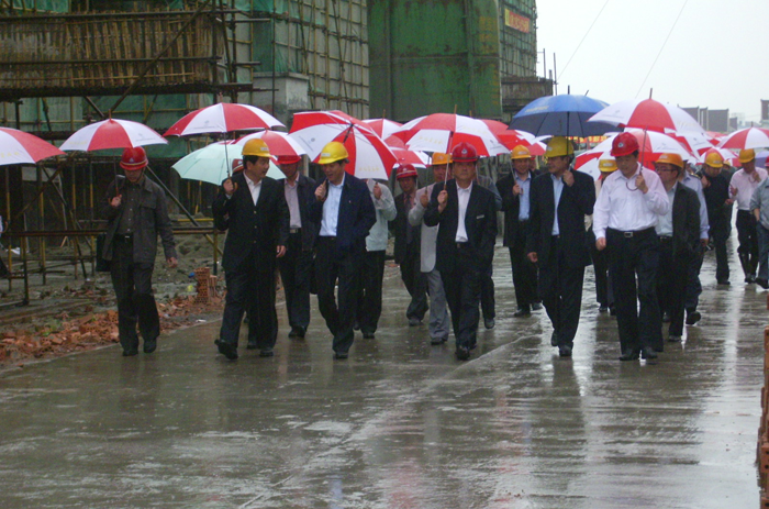南匯區(qū)立功競(jìng)賽領(lǐng)導(dǎo)小組組長(zhǎng)朱明福副區(qū)長(zhǎng)率質(zhì)監(jiān)、安監(jiān)、技監(jiān)等部門領(lǐng)導(dǎo)冒雨來(lái)到公司開(kāi)發(fā)建設(shè)的D地塊工地進(jìn)行視察。