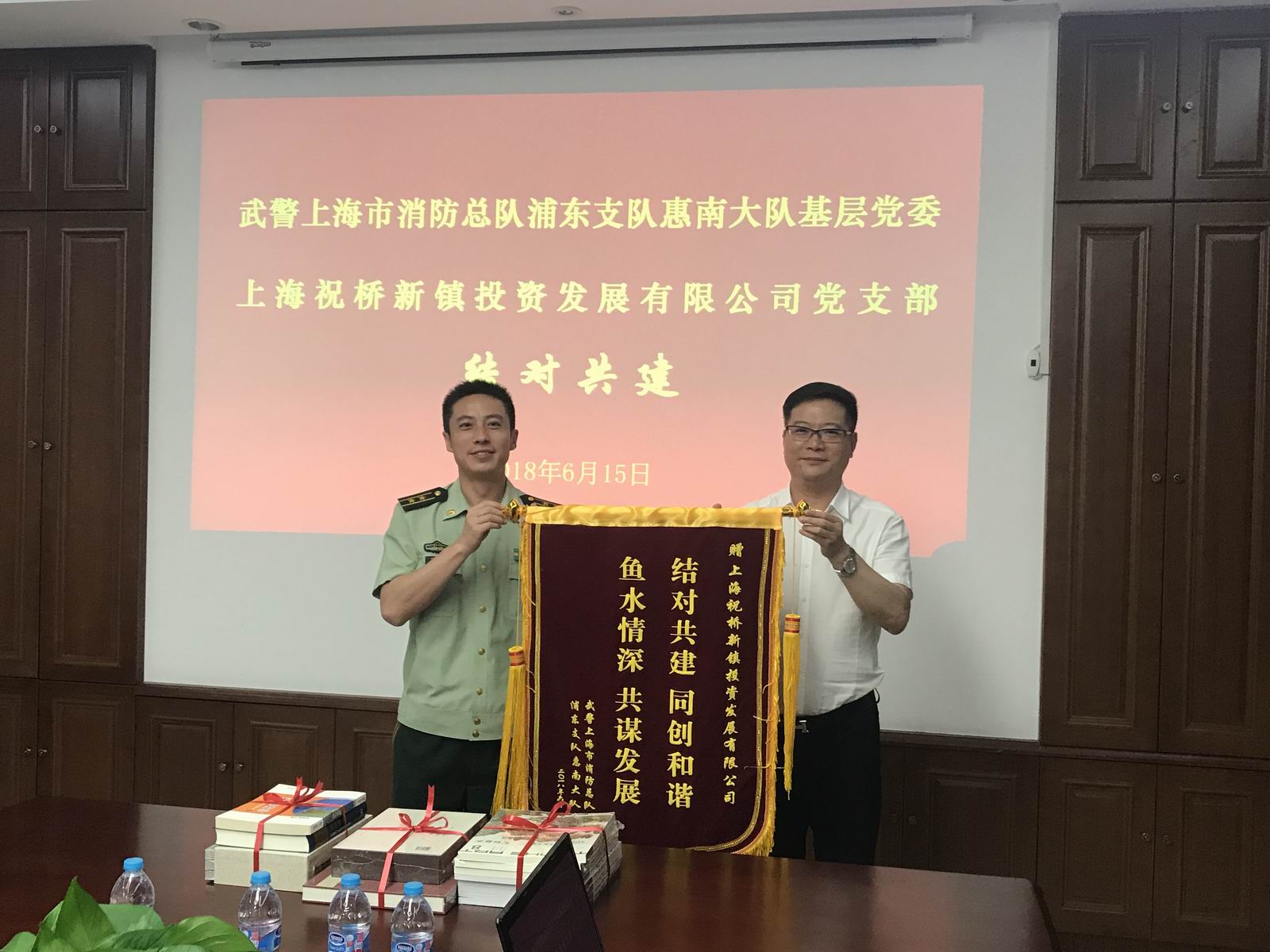 結(jié)對(duì)儀式上,雙方互贈(zèng)錦旗,新鎮(zhèn)公司向武警浦東支隊(duì)惠南大隊(duì)贈(zèng)送了書(shū)籍。