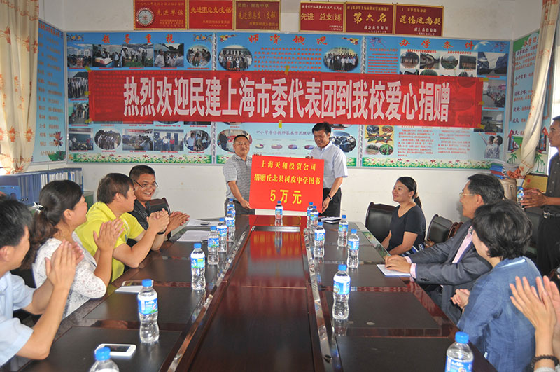 在丘北縣樹皮中學(xué),上海民建代表團(tuán)與當(dāng)?shù)氐姆鲐氜k、教育局領(lǐng)導(dǎo)和學(xué)校代表進(jìn)行了座談,并參加了民建松江區(qū)委、東亞銀行和上海天和投資公司分別向丘北縣樹皮中學(xué)捐贈(zèng)教學(xué)設(shè)施和圖書的儀式。